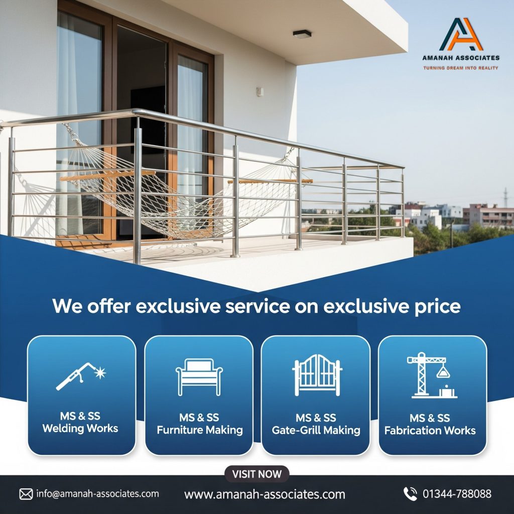 Amanah Associates এর পক্ষ থেকে আপনাকে স্বাগতম! আপনি কি আপনার বাড়ি, অফিস কিংবা প্রতিষ্ঠানের জন্য আধুনিক এবং টেকসই মেটাল সলিউশন খুঁজছেন? তাহলে Amanah Associates হতে পারে আপনার নির্ভরযোগ্য সঙ্গী। আমরা দিচ্ছি আপনার চাহিদা অনুযায়ী MS (Mild Steel) ও SS (Stainless Steel) Fabrication, Welding এবং ডিজাইনে কাস্টমাইজড বিভিন্ন মেটাল পণ্য।